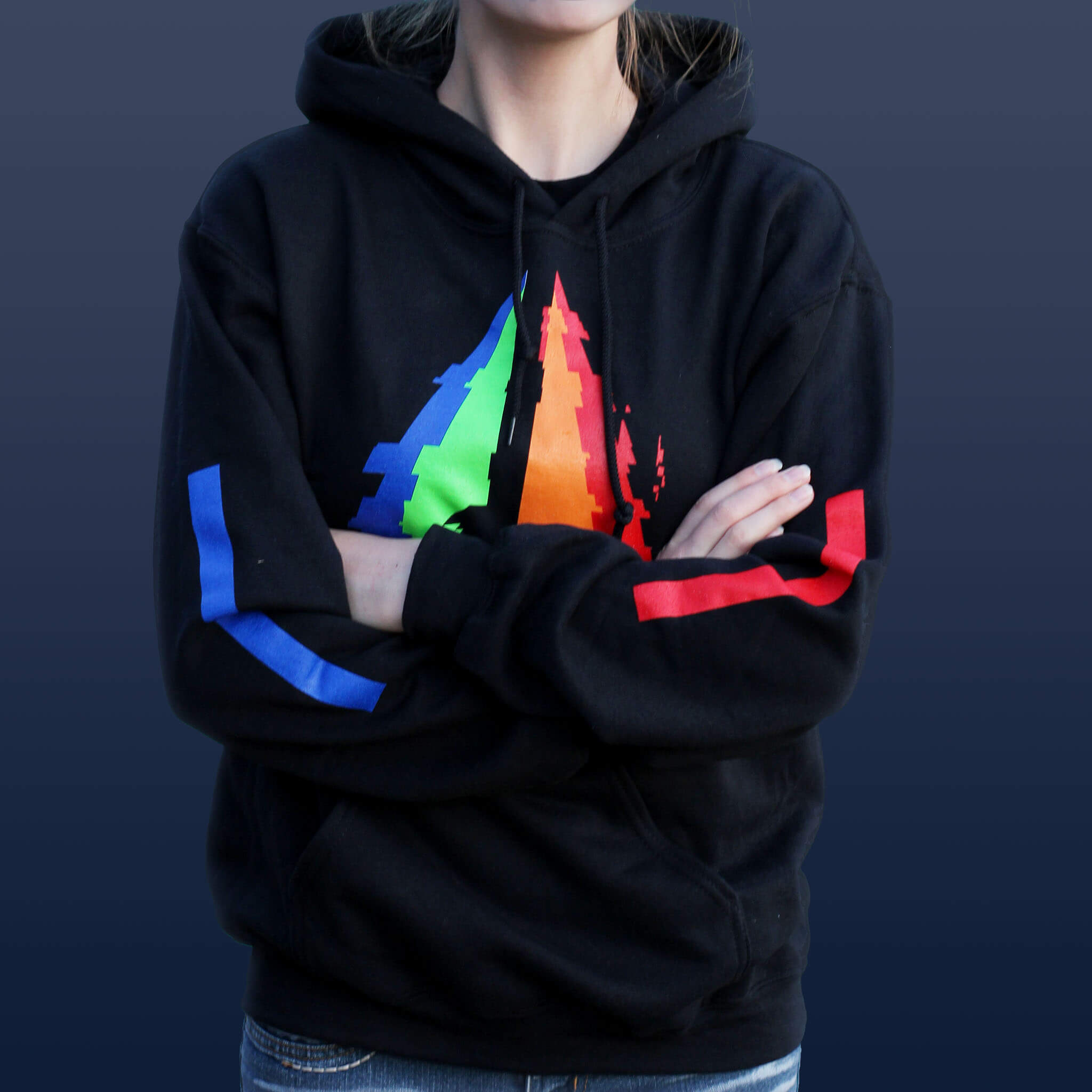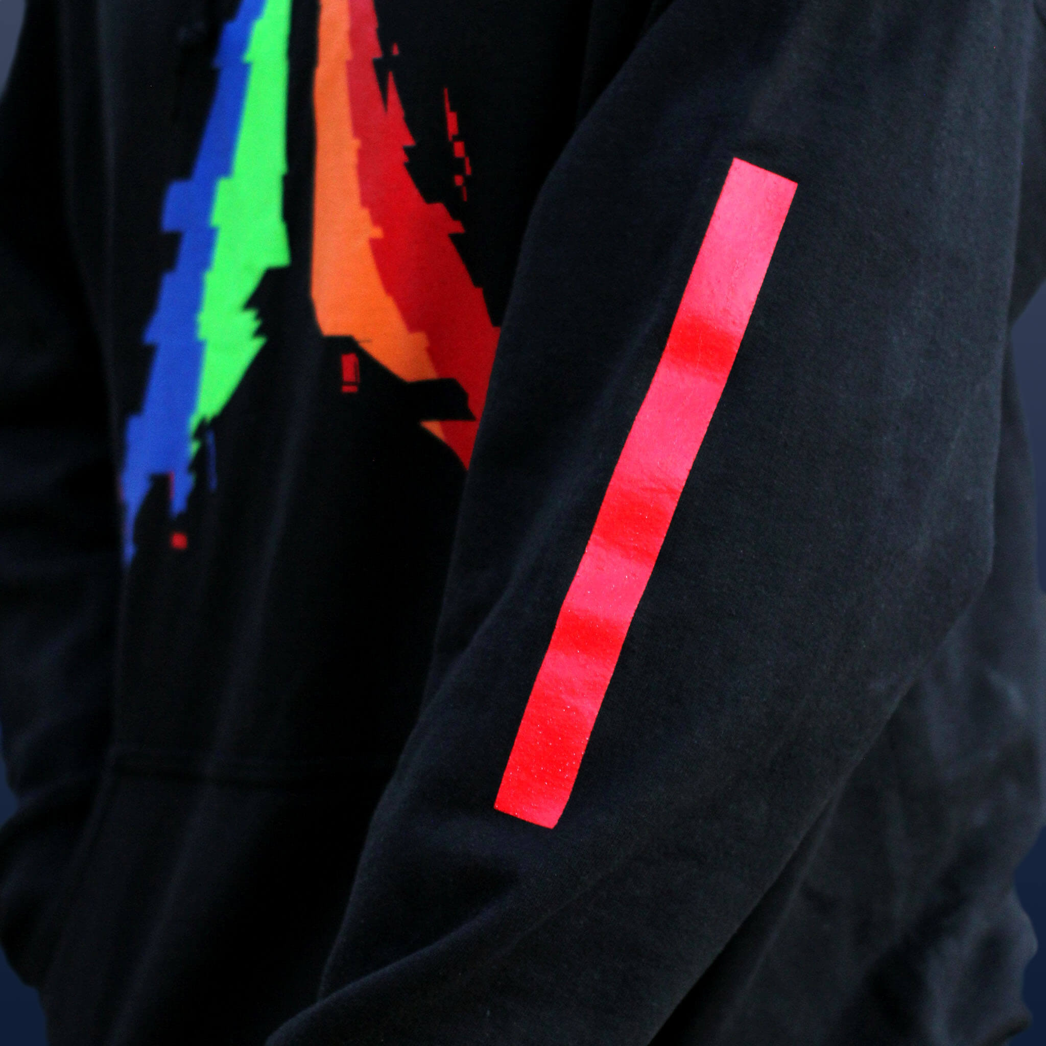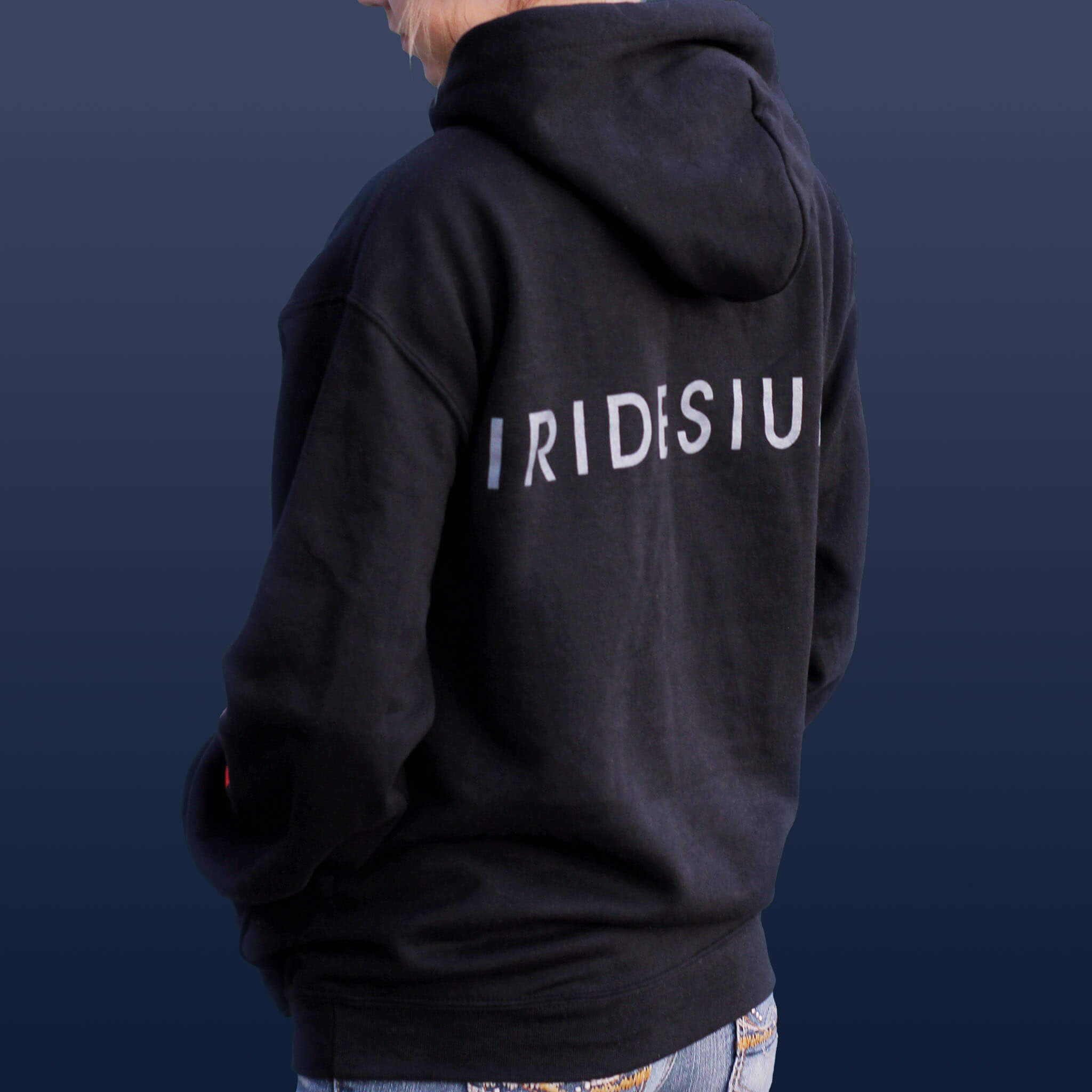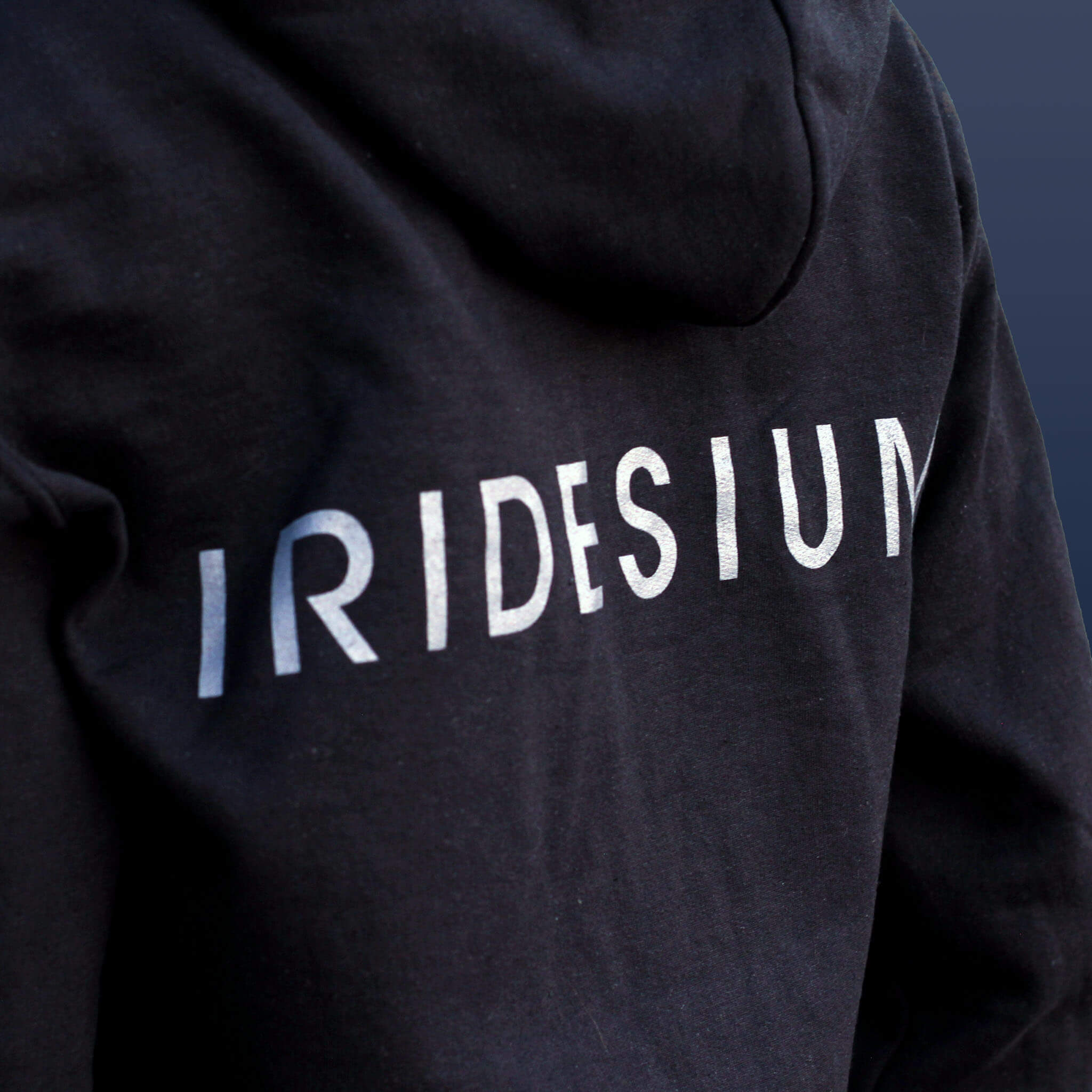The first-ever Iridesium hoodie is an all-black 50/50 pullover with a kangaroo pouch. The Iridesium Logo is printed glitching out on the front of the hoodie. Across the back is the word Iridesium, printed in a dark gray. There is a stripe on each sleeve to give the hoodie some extra flair.