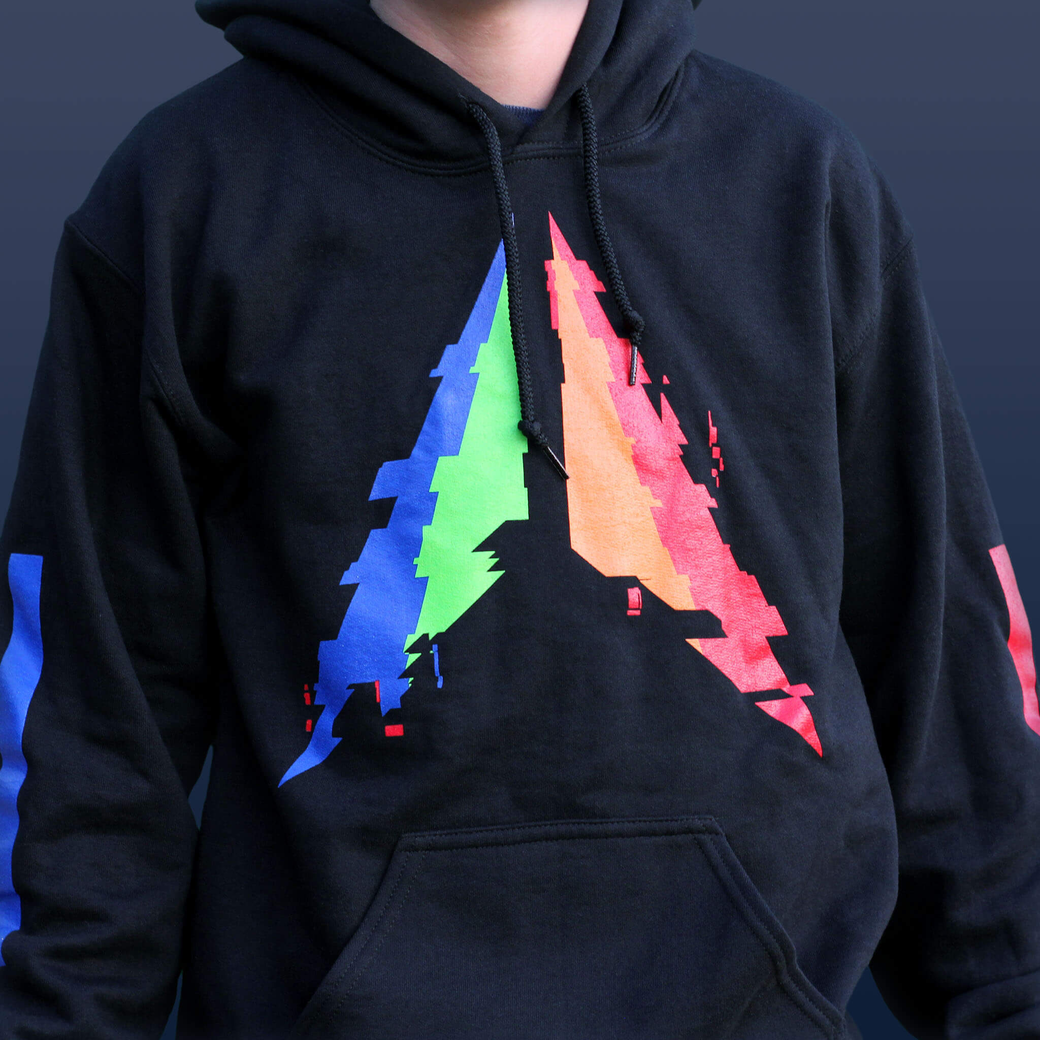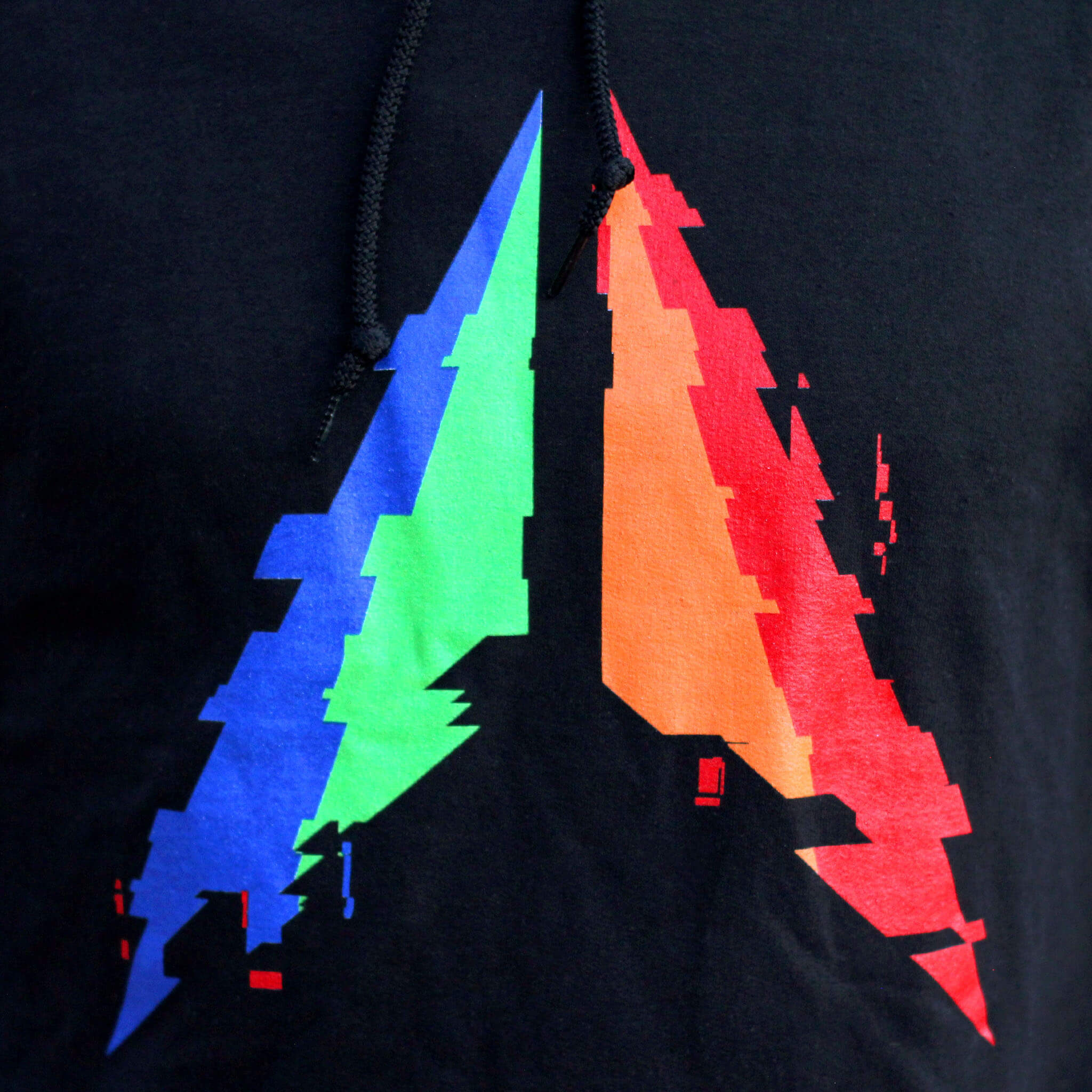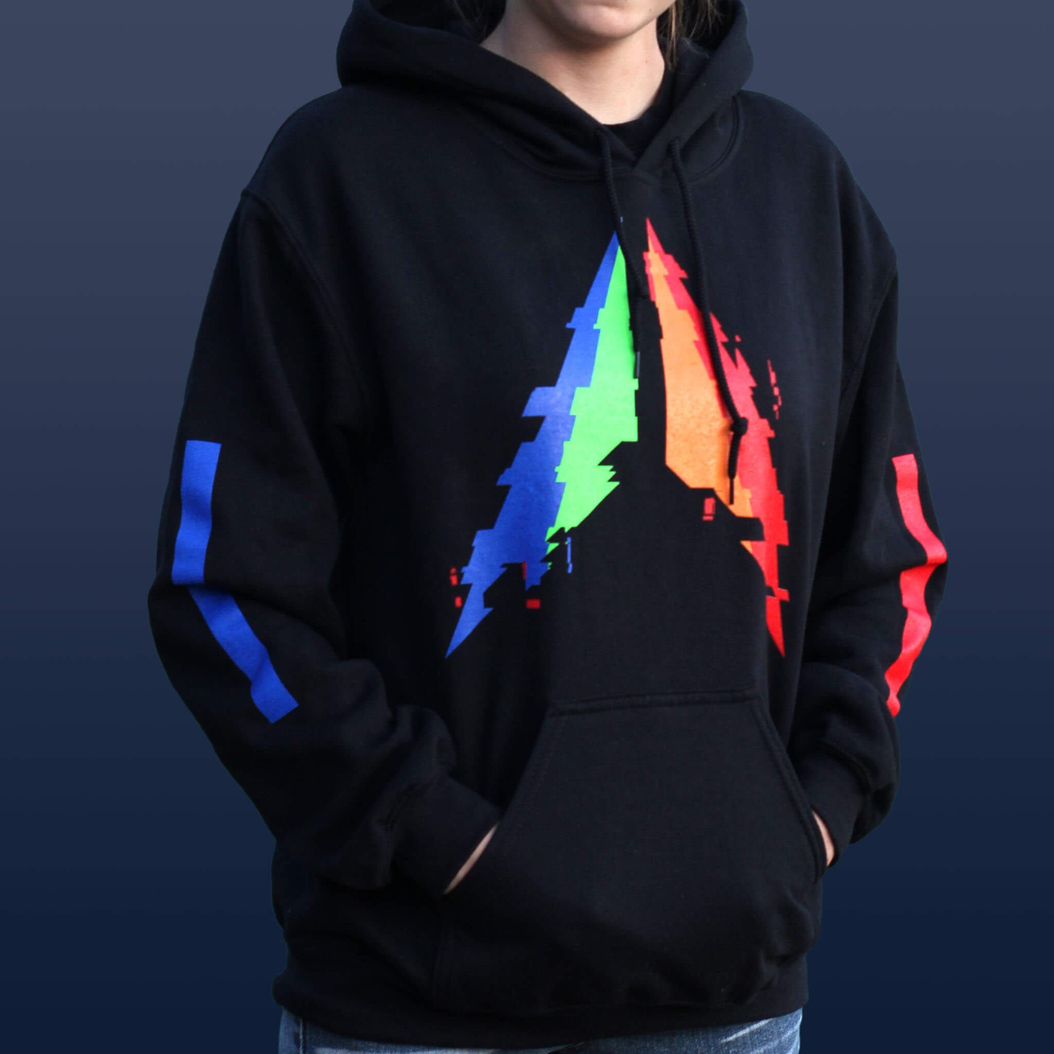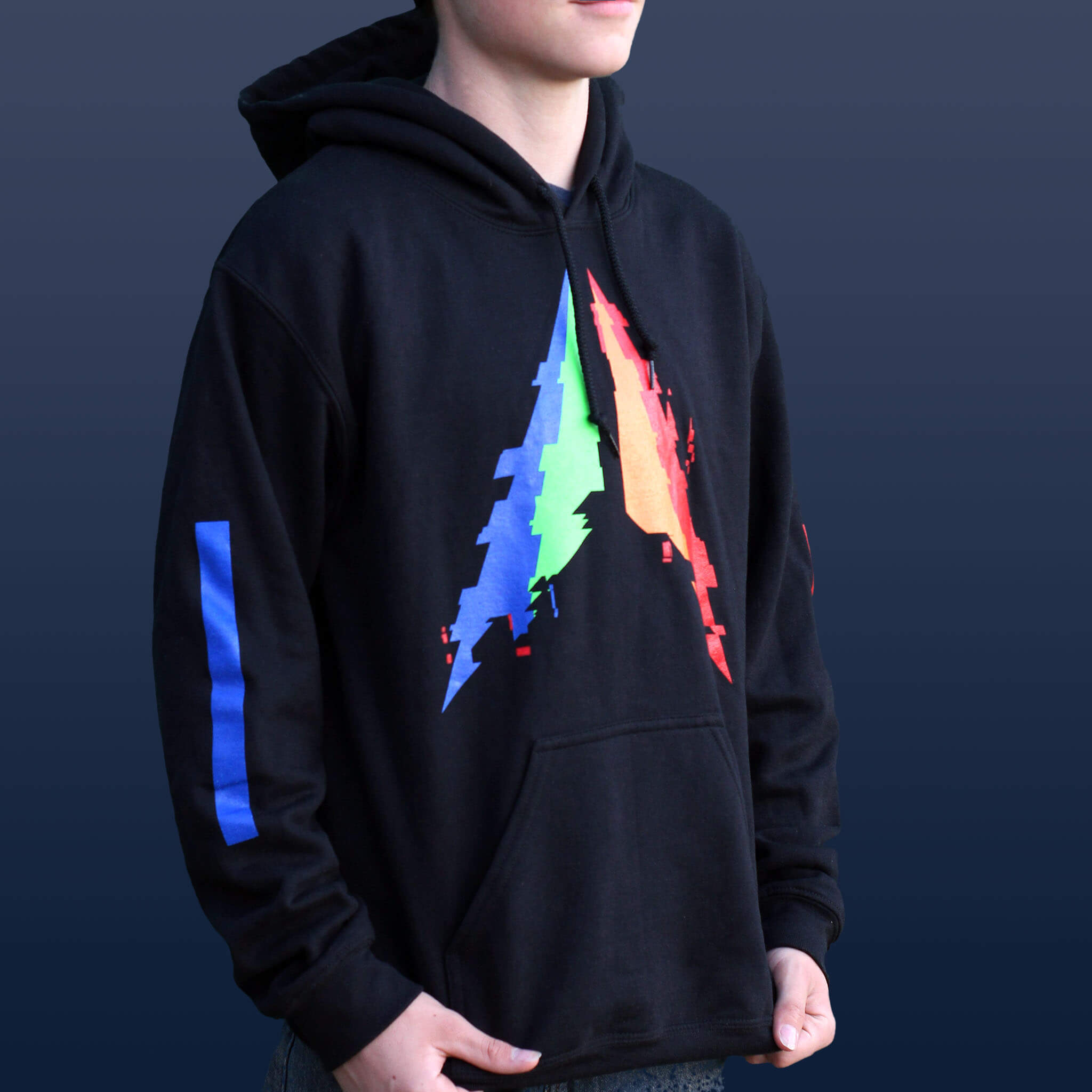 The first-ever Iridesium hoodie is an all-black 50/50 pullover with a kangaroo pouch. The Iridesium Logo is printed glitching out on the front of the hoodie. Across the back is the word Iridesium, printed in a dark gray. There is a stripe on each sleeve to give the hoodie some extra flair.